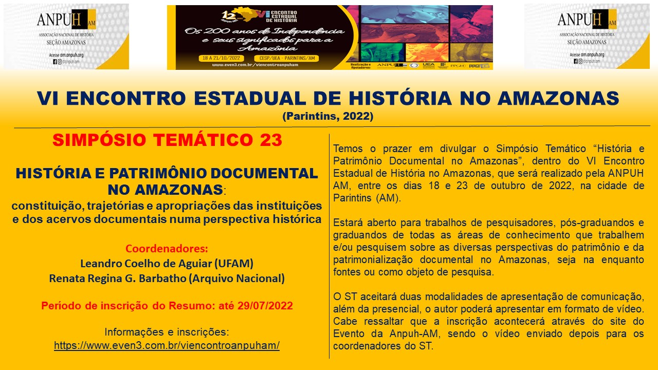 Temos o prazer em divulgar o Simpósio Temático História e Patrimônio Documental no Amazonas, dentro do VI Encontro Estadual de História no Amazonas, que será realizado pela ANPUH AM, entre os dias 18 e 23 de outubro de 2022, na cidade de Parintins (AM).